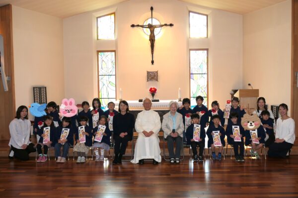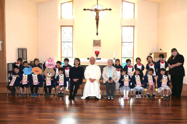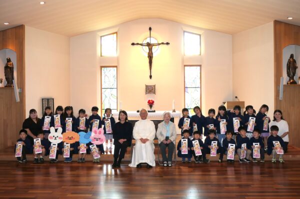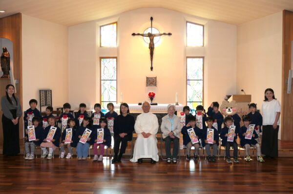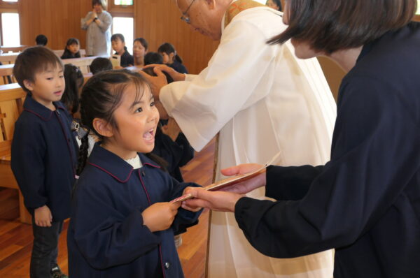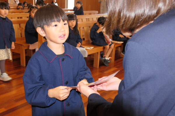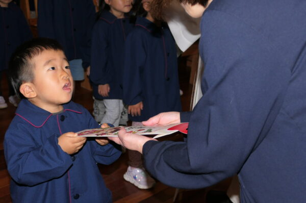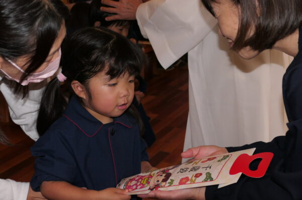 神父様から祝福を受け、千歳飴とA組さんは記念品を受け取りました。