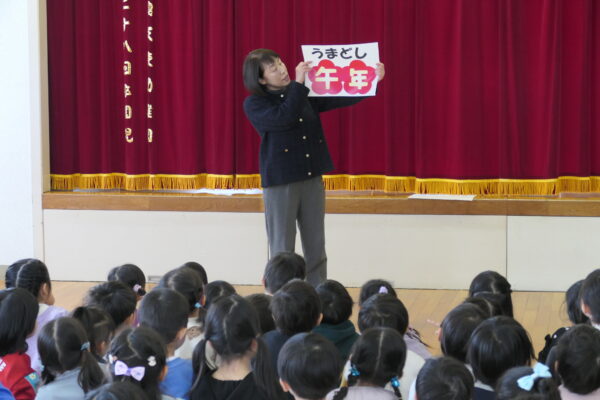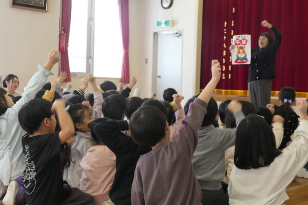 「馬はすごい速さで行きたい場所に走っていくから、午年はやりたいことにチャレンジすると実現する年です」というお話を聞いた後、「やりたいことにチャレンジしようね。えいえいおー!!」とみんなで気合をいれました。