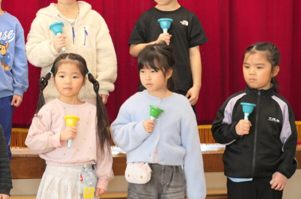 まずはA組さんからハンドベルとお歌「虹」の発表♪